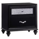 Create an aura of dark glam with this modern two-drawer nightstand. The classic silhouette features metallic acrylic drawer fronts that dazzle. Sleeken up a chic bedroom with the bold black finish. Facetted crystal hardware creates a stark contract against the deep hues while creating visual pops of intrigue. The tapered legs feature beautifully rounded curves.