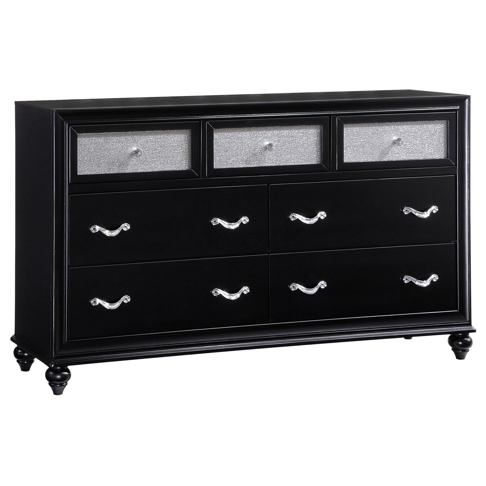 For a glam look with plenty of bling and panache, look no further than this stunning 4-piece bedroom set from the Barzini collection. The bed features an imposing headboard and low footboard with metallic leatherette-padded upholstery. The nightstand and dresser both have metallic acrylic drawer fronts accentuated by faceted crystal hardware. The majestic dresser also includes room for the tall, rectangular wood-frame mirror. The entire set is finished in a timeless black that conveys a Godfather-esque dark glam ambiance to the bedroom.