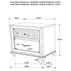 two-drawer nightstand, five-drawer chest, and seven-drawer dresser with