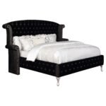 Perfectly suited for more transitional bedrooms, this panel bed features a tall panel headboard and footboard. With a white finished frame throughout, this bed offers extra touches such as channel tufted paneling wrapped in a metallic leatherette upholstery and sparkling accents. The white frame also features molding accents a well as turned feet on the footboard. Place this bed in a primary suite to lend a more glamorous vibe. This bed frame is available in several sizes as well.