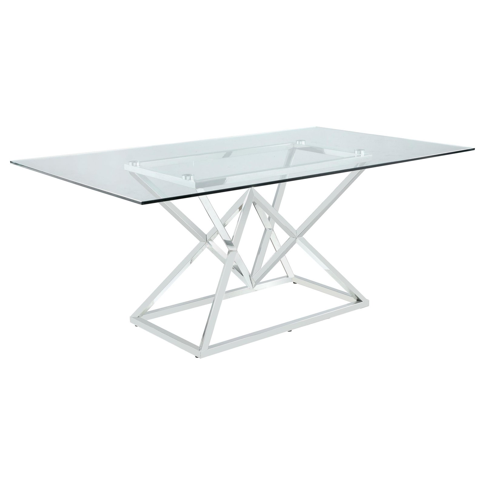 With an Art Deco flair, this six-piece dining set comes complete with a spacious table, four chairs, and a bench. The table features an angular, geometric base in a shiny chrome finish as well as a thick tempered glass tabletop with a softly beveled edge. Each of the four chairs offer a channel tufted, rolled back and the bench offers a padded, button tufted seat. These upholstered pieces are wrapped in a soft dark grey velvet with sleek flared legs that mimic the table base finish. This stunning table makes the perfect addition to a modern dining with a fun Hollywood glam vibe.