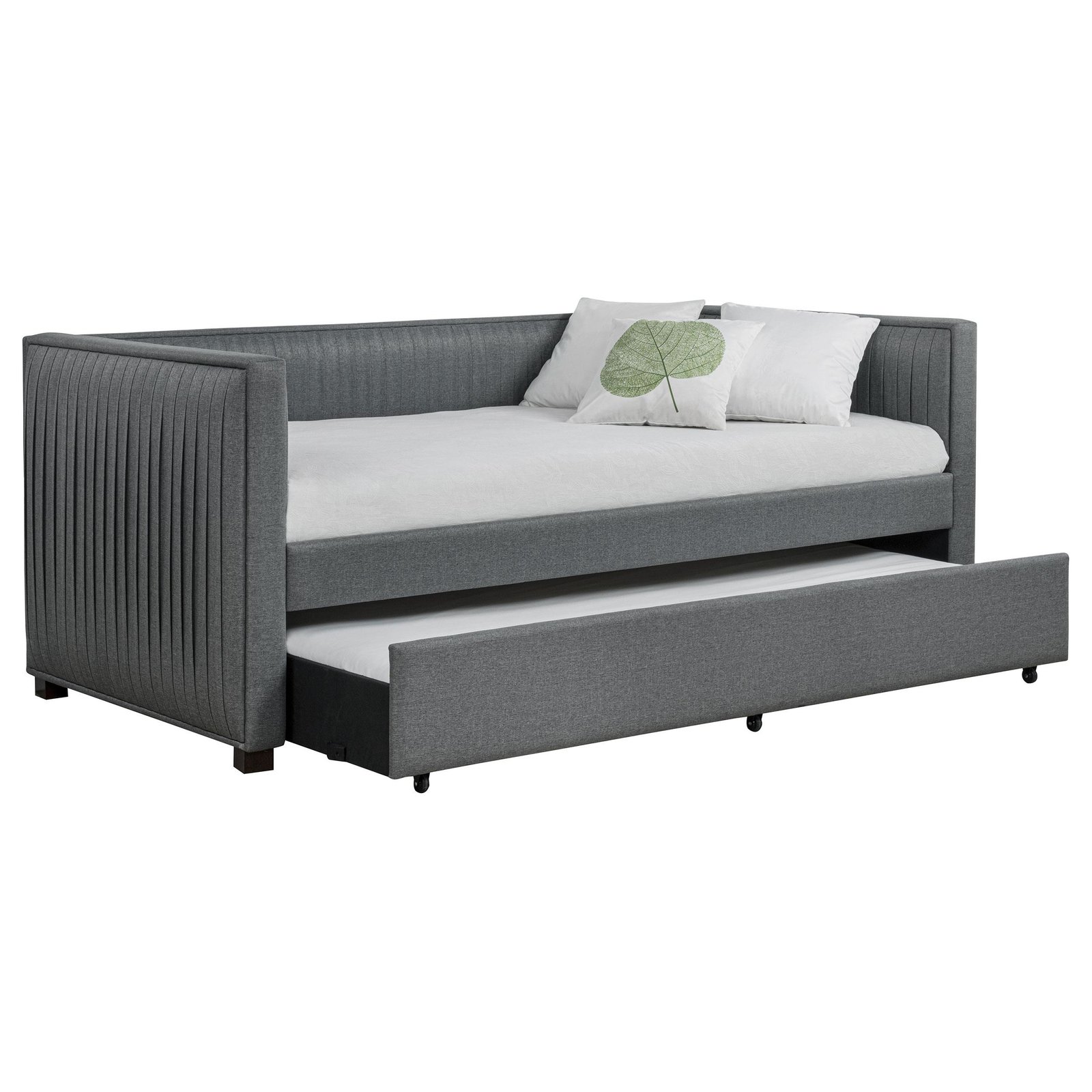 A gray fabric, pleated and overlapping along the surface of this twin daybed and trundle set, create a textured appearance against the clean straight lines. The narrow arms and backrest invite you to get creative with your own accent pillows and throws, opening this furniture piece up to becoming a lounge sofa or a bed for additional overnight guests. A trundle slips beneath the main frame when not in use or can be retrieved and glided out effortlessly. Black finish feet add slight elevation and a pop of contrast against flooring and rugs too. This twin daybed trundle set is the perfect addition for compact, multipurpose spaces like home offices and guestrooms.