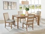 Soothing natural, neutral hues introduce refined style to a modern room set. Offering a soft natural brown wood grain finish over ash veneer and Asian hardwood, the set delivers an inviting, approachable ambiance to your kitchen or dining room. The table features a spacious rectangular tabletop with angled legs and an angular apron, creating eye-catching flair. Chairs offer soft oatmeal fabric upholstery over plush foam padding, and feature wooden ladder details on chair backs, adding a sense of character and structure. This charming set is a perfect choice for a family dining room.