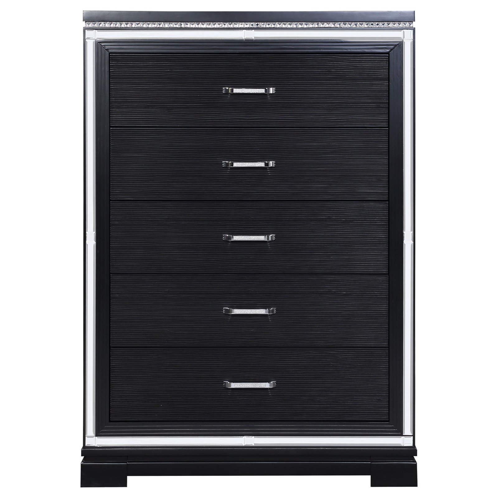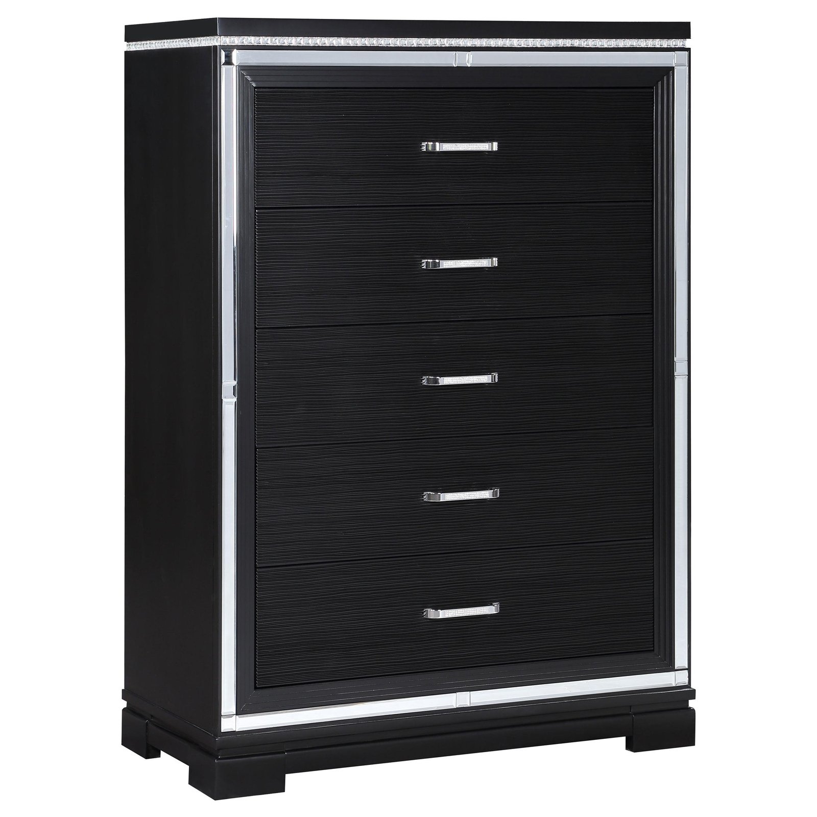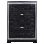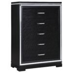Dramatic and contrasting, this glam five-drawer chest offers a luxe look while offering up floor space with its tall, stacked design. Spacious drawers outlined in a polished mirror trim and a wood grain texture elevate the black finish frame. Each drawer mirrors the tile with their diamond-like encrusted handles and slim silhouettes. This stately chest of drawers also lends a bold look with its deep black finish, making the accents pop within a dramatic bedroom. This chest also features modern touches like a felt-lined top drawer where you can keep valuable delicates and other keepsake items.