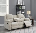 Charlotte Motion Sofa – Neutral Cream FabricThis versatile cream fabric sofa blends seamlessly with any decor style. The manual reclining function and pocket coil cushions provide customizable comfort, while the drop-down table offers hidden functionality. Detachable backs simplify delivery. Frequently searched as “neutral cream sectional sofa” or “reclining living room furniture with storage.”