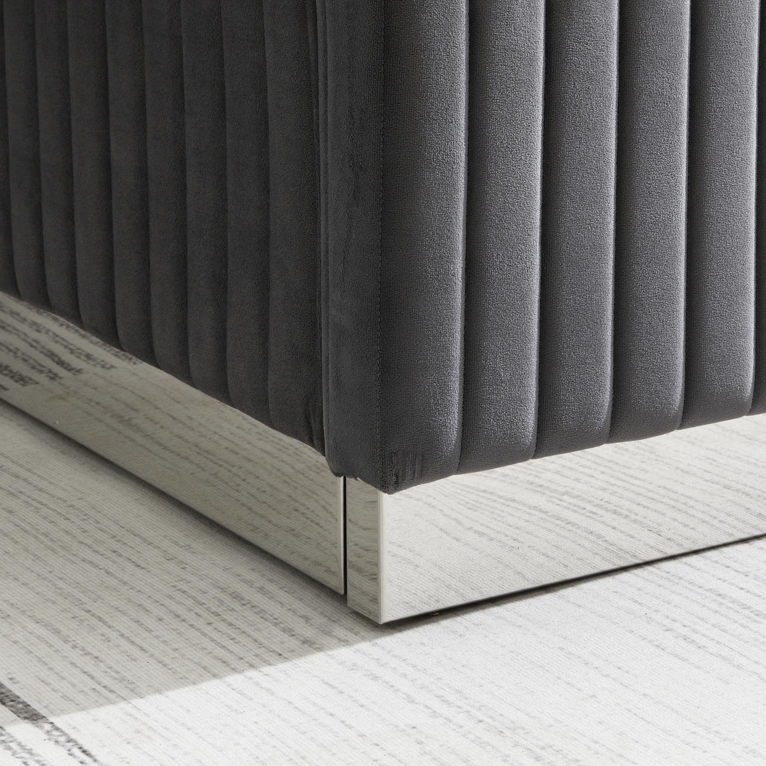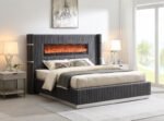 Gray Luxurious Velvet, Vertical Line Accents, Silver Accented Bed Base, Built In Led Fireplace, Bluetooth Speaker Capability, USB and Type-C Ports, Mattress Ready; No Foundation Required
