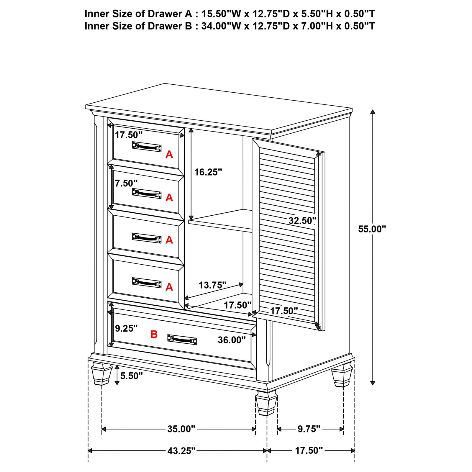 | Dimensions | 43.25 × 17.5 × 55 in |