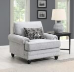Light Gray Chenille Fabric, Roll Arms, High Density Foam Cushion Seating, Hand Applied Nail Head Trim, Multi Color Accent Pillows, 100% Solid Wood Frame
