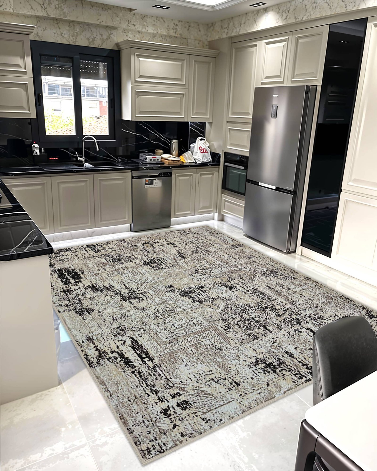settings — e.g., the sleek grey rug paired with modern pillows or metallic