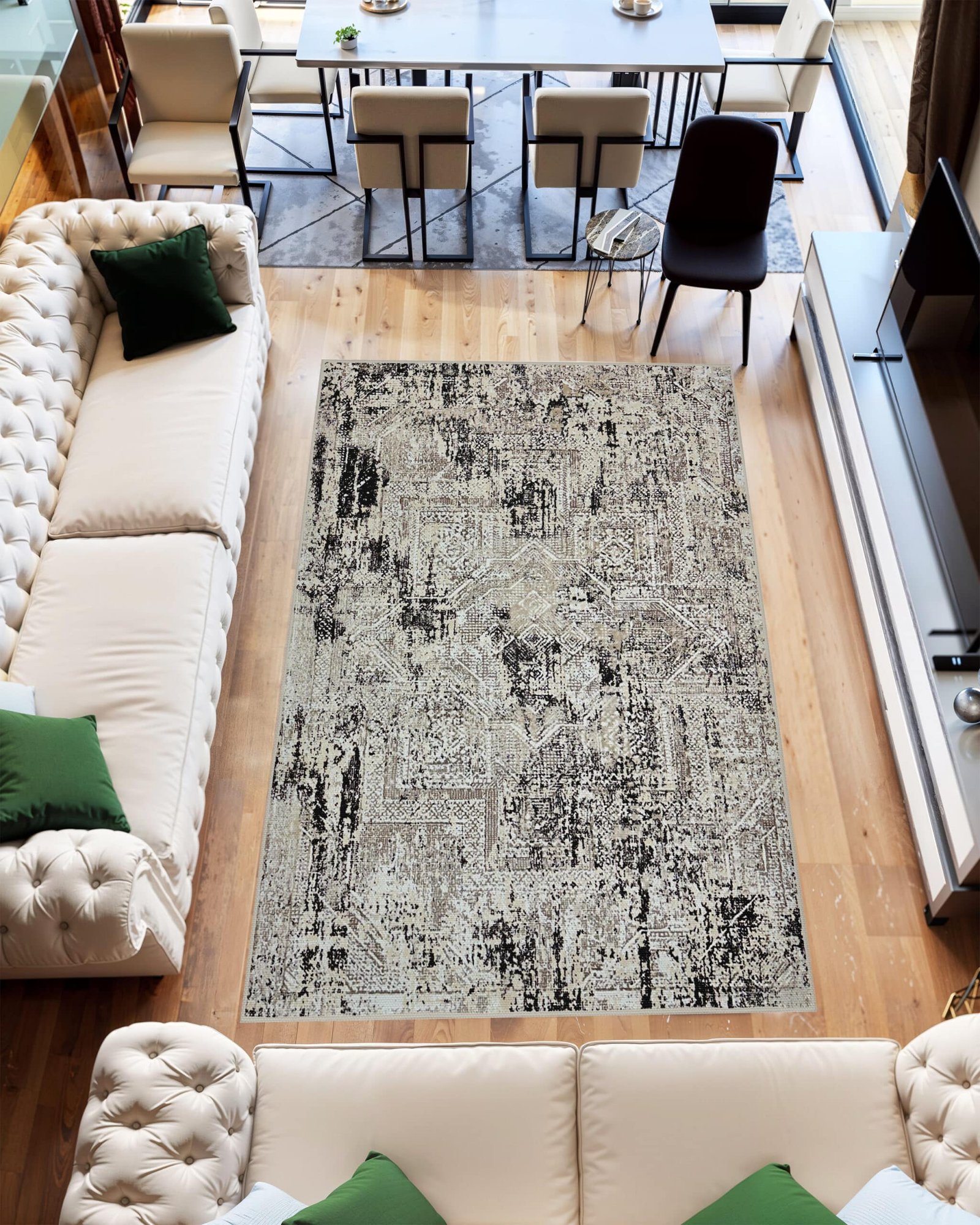 settings — e.g., the sleek grey rug paired with modern pillows or metallic
