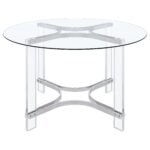 Elevate your dining experience with this chic, contemporary dining set, where modern design meets airy elegance. This set includes a stunning round glass-top table with clear acrylic legs that create a sleek, sculptural profile, complemented by gleaming chrome accents for a touch of sophistication. Four side chairs with clear acrylic seats and backs complete the set, adding a minimalist yet comfortable touch to your space. The sled-inspired chrome bases of the chairs provide stability and a dynamic contrast to the graceful curves of the acrylic, making this set an eye-catching centerpiece for any modern dining room or breakfast nook. Perfectly suited for compact spaces, this set combines style and functionality, offering a light and open feel that effortlessly enhances any decor.