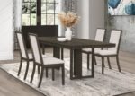 Upgrade your dining area with this chic transitional dining set, featuring a sleek dark grey finish and subtle chevron pattern on the table top. The table boasts a clean and simple trestle base design, while the chairs offer comfortable beige upholstered back and seat. The server has ample storage with three drawers and two shelves, including brown felt-lined top drawers.