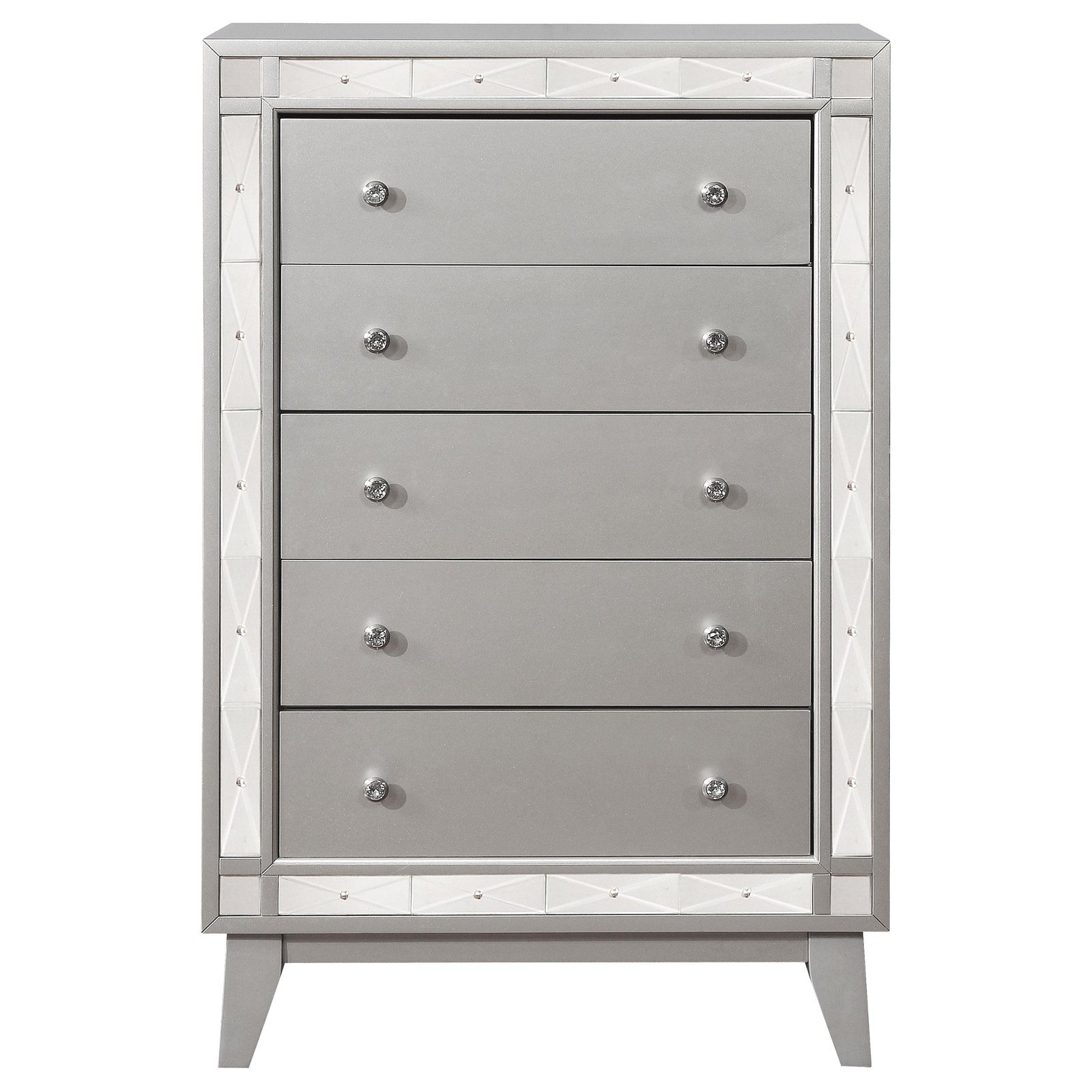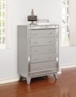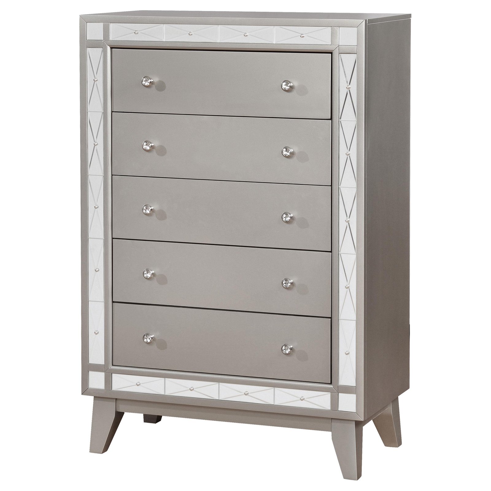 With brilliant, mirror-like accents, this chest adds a touch of shimmer to any bedroom. Jewel-like drawer handles lend an additional touch of shine. Its upgraded, metallic finish is reminiscent of sparkling mercury. Five large drawers offer plenty of convenient space for storage. With a glamorous, transitional design, this stunning chest really stands out.