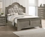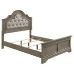 Handsome attributes elevate the elegance of this traditional bed, featuring a scalloped, arched padded headboard and classic wood molding details. Covered in a wheat finish throughout its wood trim and surfaces, this charming bed provides a cozy retreat with its button-tufted insert wrapped in a cream linen-like fabric. Bracket style legs elevate the low-profile footboard topped with crown molding and dual panels for a classic approach. Neutral tones in the curvaceous padded headboard and bed frame invite you to throw together bedding and bedroom color palette of your choosing. Country-inspired wood tones also lend to a modern farmhouse style.