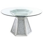 Host a small gathering in your dining room with this modern glam dining table set, consisting of a spacious, round dining table and four side chairs. A clear glass tabletop creates breathability and shows off the stunning faux diamond inlay of the hourglass-shaped pedestal base. Created in a hexagonal profile, the pedestal base is lined with mirror tile along the outer edges, offering a sleek and sophisticated flair. Surround the table with the four velvet upholstered side chairs, featuring channel tufted rolled backs that give off a classically designed aesthetic. Lustrous stainless steel flared legs reflect the mirror accents, offering a cool tone metallic touch.